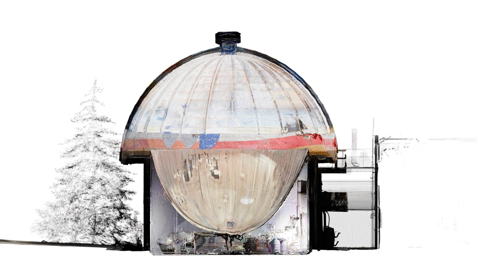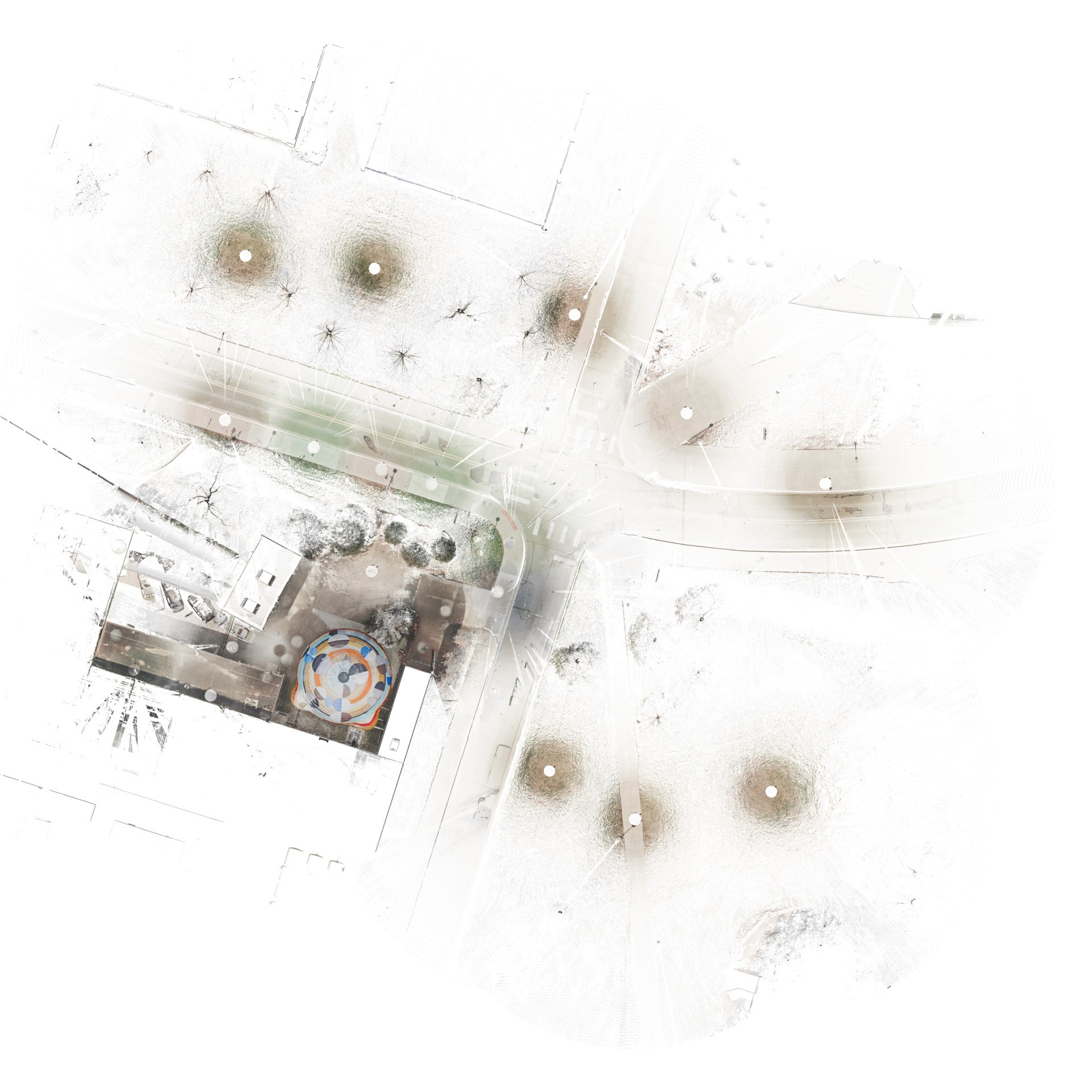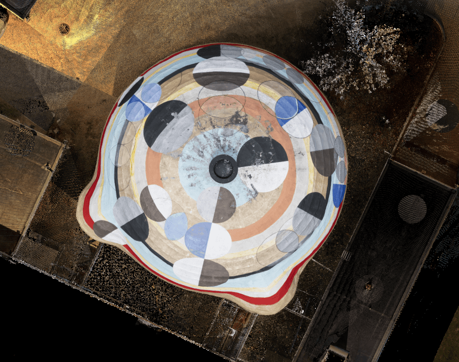 To capture this complex artwork before its loss, cutting-edge documentation technologies were utilized. A FARO 3D Focus Lidar Scanner captured precise three-dimensional point clouds, creating a comprehensive digital model. Complementing this, aerial photogrammetry provided high-resolution imagery for detailed 2D and textured 3D models. This aerial data collection was a collaborative effort with graduate students from the School of Environment and Sustainability (SEAS), whose expertise was invaluable. The documentation was completed well in advance of the demolition.